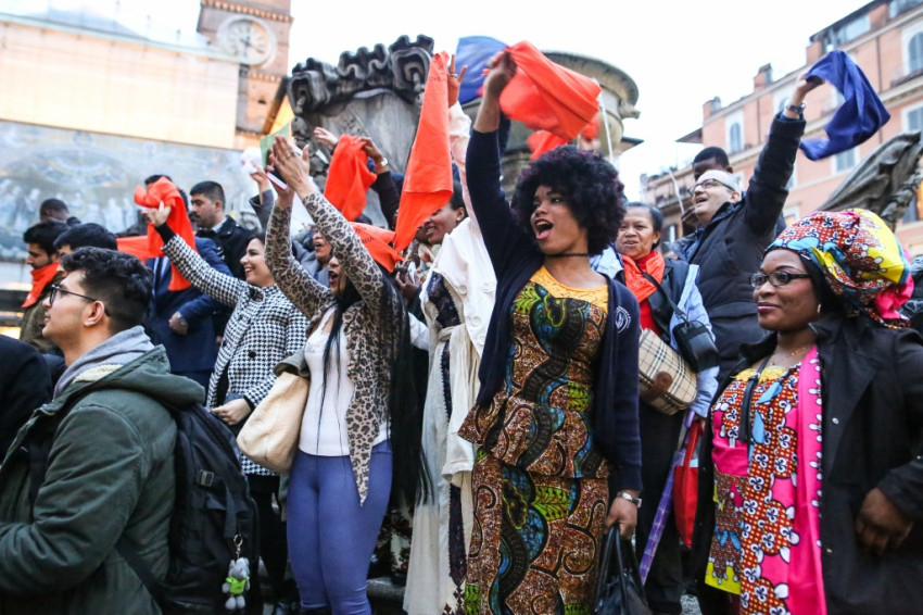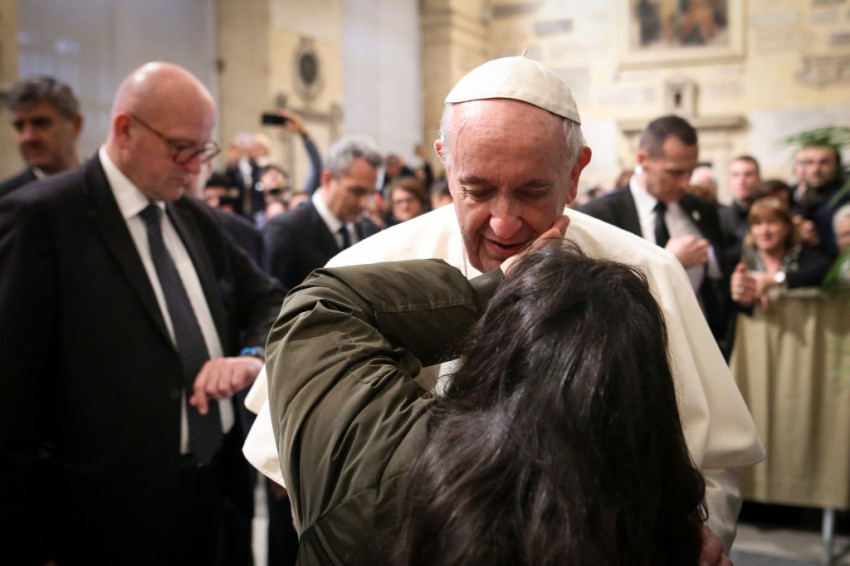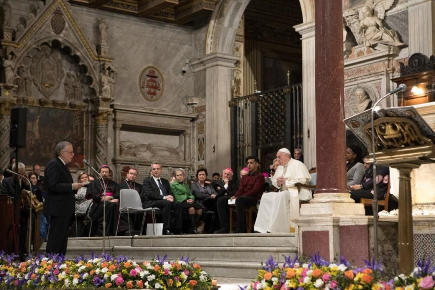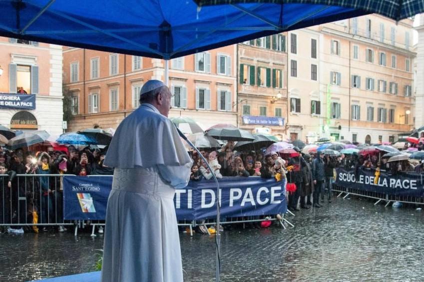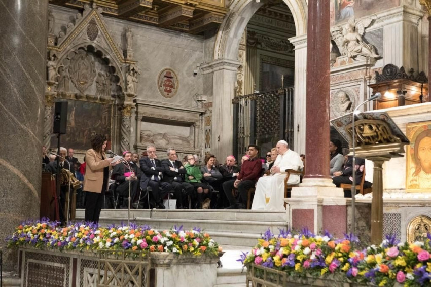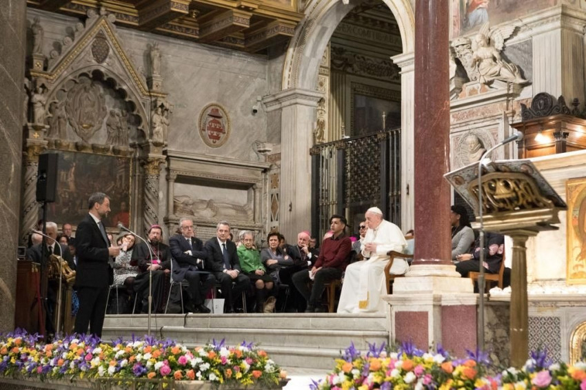 A bazilika előtti teret megtöltötte a közösség nagy népe: szegények és jómódban élők, idősek és fiatalok, gyerekek, betegek, fogyatékkal élők, a humanitárius folyosókon keresztül érkezett menekültek... Zuhogó esőben érkezett a pápa, a templom előterében Marco Impagliazzo, a Sant’Egidio elnöke fogadta: „Milyen szomorú az az Egyház, ahol a szegények kliensek, nem pedig testvérek” – fogalmazott, és kijelentette: „Mi Önnel együtt egy olyan Egyházról álmodunk, amely egy nagy nép, amelynek mindenki a tagja, amelyből senki nincs kizárva, hogy Isten irgalmassága megérintse minden ember szívét.” Ferenc pápa az előtérből üdvözölte ezt a „népet”, és megköszönte a Sant’Egidio nagylelkűségét, azt, hogy nyitott a szívük mindenkire, megkülönböztetés nélkül.