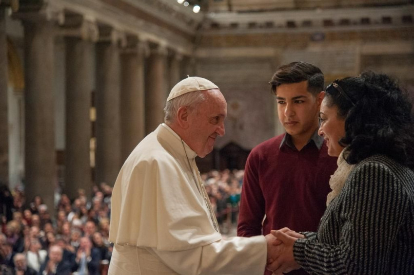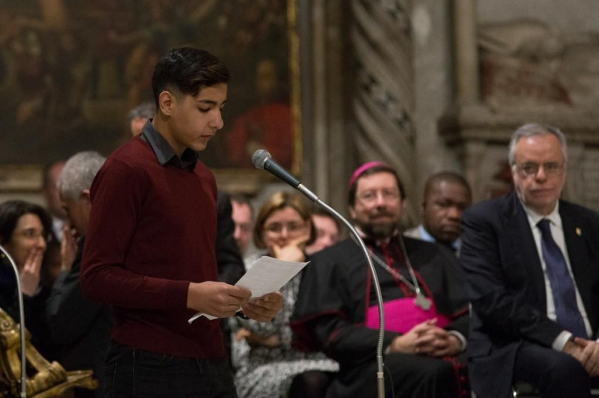 A szíriai palesztin Dzsafar megköszönte a Szentatyának a menekültek iránti szeretetét. A humanitárius folyosókon, biztonságos úton érkezett Olaszországba édesanyjával és két kisebb testvérével, egy libanoni menekülttáborból, ahol három évet töltöttek. Damaszkuszban palesztin menekülttáborban élt, a háború alatt alig volt mit enniük, és amikor édesanyja kiment élelemért, egy bomba csapódott be mellettük. Fiát meg tudta védeni a repeszektől, ő maga azonban megvakult. Dzsafar elmondta a pápának, hogy most már iskolába jár, focizik, és a Fiatalok a békéért mozgalomban magányos időseket látogat barátaival.