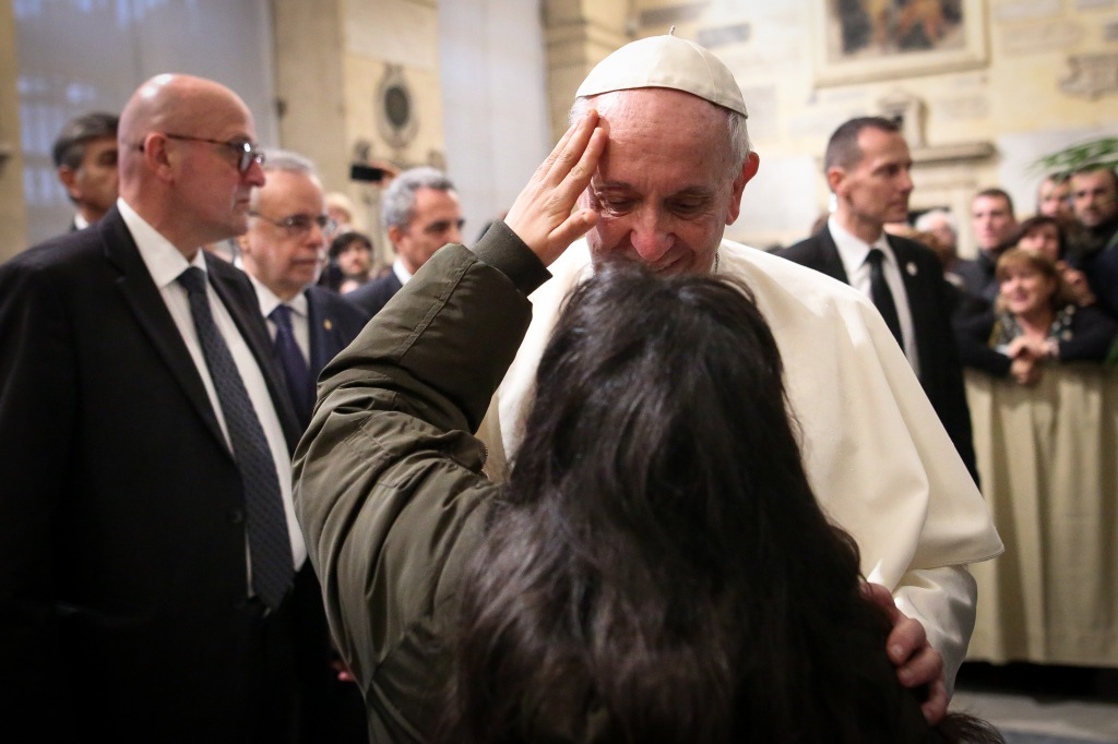 A Szentatya az előtéren áthaladva üdvözölte az embereket, igyekezett minél több kezet megfogni, minél több tekintetet viszonozni. Különleges pillanat volt, amikor megállt egy látássérült nő előtt, aki felállt, megölelte és lassan, hosszan simogatta az arcát, a pápának, akit – mint mondta – nagyon szeret, de eddig nem tudta elképzelni, milyen lehet. A körülötte állók számára megállt az idő: hiába a tömeg, Ferenc pápa figyelme hosszan, 2-3 percig időzött ezen az asszonyon, akkor, ott csak ő létezett számára, hiába volt a testőrök sürgetése.