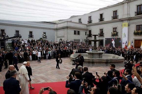 A reggel kilenc órakor kezdődő találkozón mondott beszédében Ferenc pápa örömét fejezte ki, hogy tavaly szeptemberi kolumbiai látogatása után ismét Latin-Amerika földjén lehet, abban az országban, ahol néhány évet töltött fiatal jezsuitaként. A Szentatya idézte a chilei nemzeti himnusz sorait: „Óh, Chile, eged tisztán kéklik, tiszta szellők fújnak át rajtad. Mezeid virágokkal ékesek, a mennyország boldog másai.” „Ez az ének hazátok dicsérete, tele ígérettel és kihívással, de főként a jövő ígéretét hordozza. Földrajzi sokszínűségetek és gazdagságotok lehetővé teszi, hogy azt kulturális sokféleségetek gazdagságaként értsétek” – hangsúlyozta a pápa.