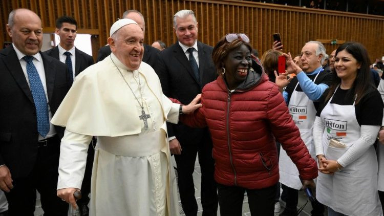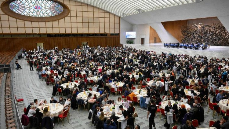 Az Úrangyala imádság után kezdődött az ebéd, a Szentatyát már várták a vendégek, üdvözölték, leültek vele az asztalokhoz. A szegények és kísérőik, összesen több mint 1200 ember, megtöltötték a VI. Pál termet, amelyet egy óriási, különleges étteremmé alakítottak át erre az alkalomra. Ferenc pápa áldást mondott, majd hálát adott Istennek a barátság pillanataiért, hogy mindannyian együtt lehetnek, köszönetet mondott az ételért és azokért, akik elkészítették.