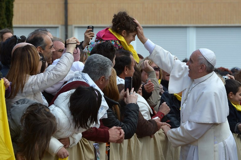A Don Carlo Gnocchi olasz pap által alapított rehabilitációs központ betegei az intézmény kapujában várták Ferenc pápát, aki egyenként köszöntötte őket.