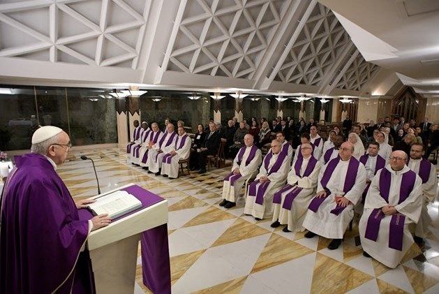 De kézbe veszi a másik dolgot, a misztériumot is, ahogy a mai olvasmányban (Jer 23,5–8) hallottuk – folytatta gondolatmenetét a pápa. – Mi ez a misztérium? Isten népének hazavezetése, „újrateremtése”, ami csodálatosabb lesz magánál a teremtésnél is. József kézbe veszi ezt a misztériumot, és segít: hallgatásával, munkájával egészen addig a pillatanig, amikor Isten magához hívja őt.