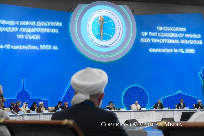 Szeptember 14-én, kazahsztáni apostoli útjának második napján a Szentatya részt vett a világvallások és hagyományos vallások vezetőinek hetedik kongresszusát megnyitó ünnepségen, valamint a plenáris ülésen, melyen a kazah köztársasági elnököt követően beszédet mondott.