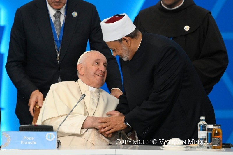 És itt szeretnék köszönetet mondani Kazahsztánnak az e téren tett erőfeszítéseiért: mindig összefogásra törekszik, mindig párbeszédet kezdeményez, mindig barátságot kínál. Ezt a példát Kazahsztán mindannyiunknak adja, és követnünk kell ezt a példát, együtt kell haladnunk vele. Ne keressük a hamis, összebékítő szinkretizmusokat – nincs rájuk szükség –, hanem tartsuk meg identitásunkat, nyitottan a különbözés bátorságára, a testvéri találkozásra. A mai sötét időkben csak így, ezen az úton sugározhatjuk Teremtőnk fényét! Köszönöm mindnyájatoknak!