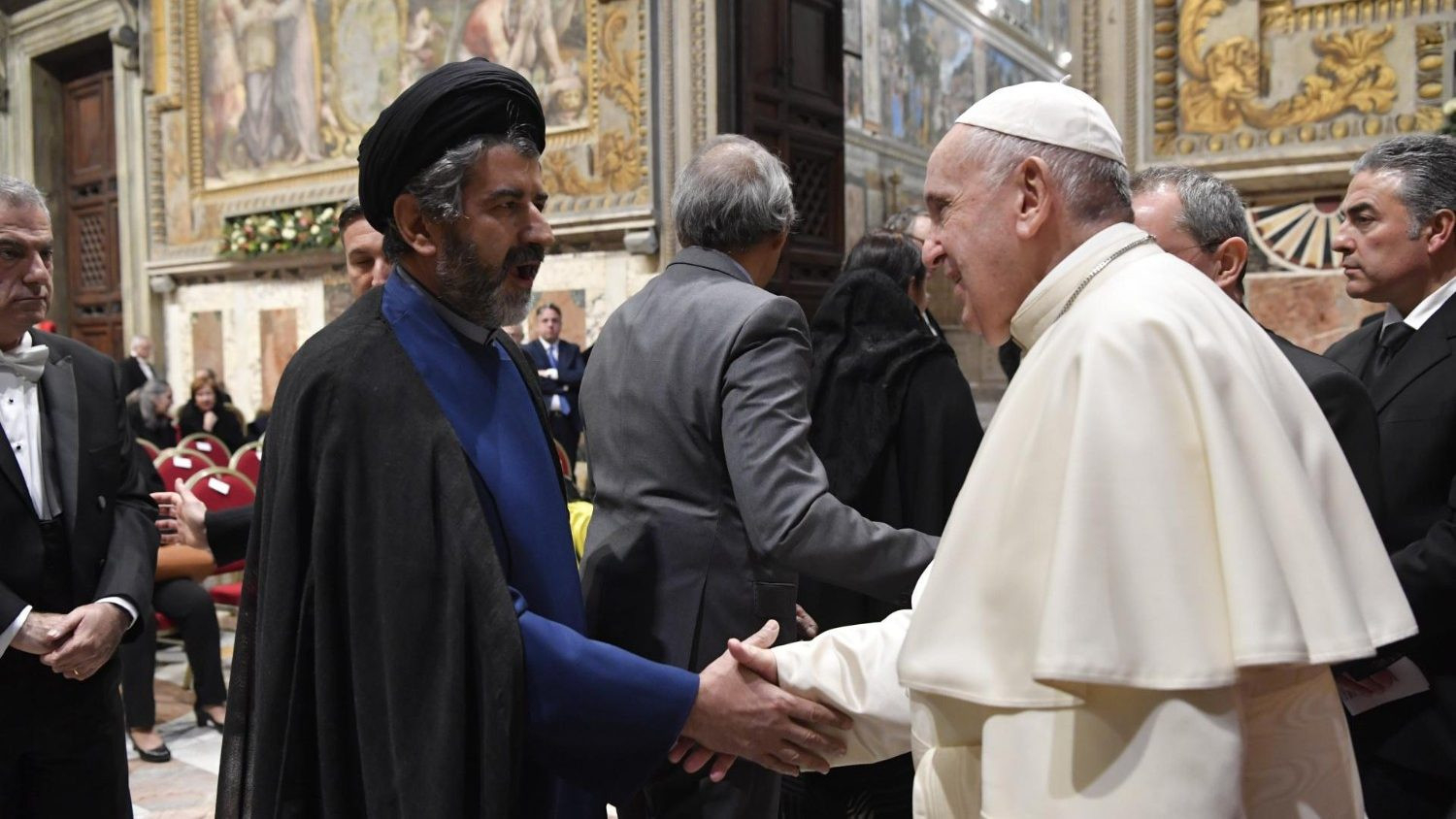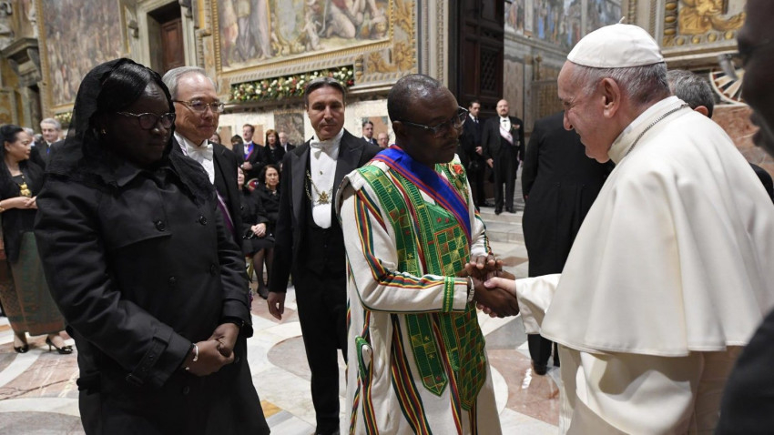 A pápa köszönetet mondott a ciprusi nagykövetnek, aki a szentszéki diplomáciai testület dékánjaként mondott köszöntőbeszédet. Az eseményen Habsburg-Lotharingiai Eduárd szentszéki nagykövet képviselte Magyarországot. A Szentszék jelenleg 183 állammal tart fenn diplomáciai kapcsolatot, továbbá az Európai Unióval és a Szuverén Máltai Lovagrenddel. 89 nagykövetség római székhelyű, de itt található az Arab Államok Ligájának, valamint az ENSZ Menekültügyi Főbiztosságának hivatala is.