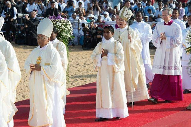 A Szentatyával közel 1100 pap koncelebrált, az oltárnál pedig közel száz bíboros és püspök. A szertartás elején és alatt a helyi folklórnak megfelelő díszes öltözetben táncosok mutattak be táncokat hagyományos szingaléz hangszerekkel játszott dallamokra. Bár kora délelőtt tartották a szertartást, a harmincfokos melegben a napsütés ellen hatalmas kifeszített ponyvákkal védekeztek. A szentmisén jelen volt a buddhista vallású új Sri Lanka-i elnök, Maitripala Sziriszena is, aki a szertartást megelőző nap döntött úgy, hogy részt vesz a programon. Indiából négy bíboros és az új szent szülőhelyének, Goának a püspöke is számos hívővel érkezett a szentmisére.