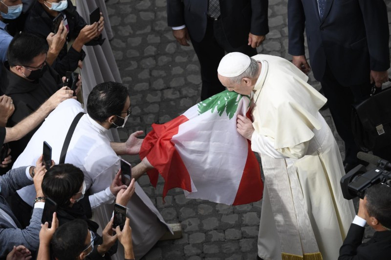 A Szentatya mellett állt egy libanoni maronita pap, Georges Breidy, kezében tartva országa zászlaját, melynek közepén a piros sávok között a jól ismert cédrusfa zöldell. Egy hónap telt el a bejrúti tragédia óta – emlékeztetett a pápa, és idézte Szent II. János Pál pápa harminc évvel ezelőtti szavait, melyeket az ország történetének egyik kulcsfontosságú pillanatában mondott. „A sorozatosan bekövetkező drámai események láttán, melyeket e föld lakói megtapasztalnak, tudatosul bennünk, milyen óriási veszély fenyegeti az ország létét. Libanont nem hagyhatjuk magára.”