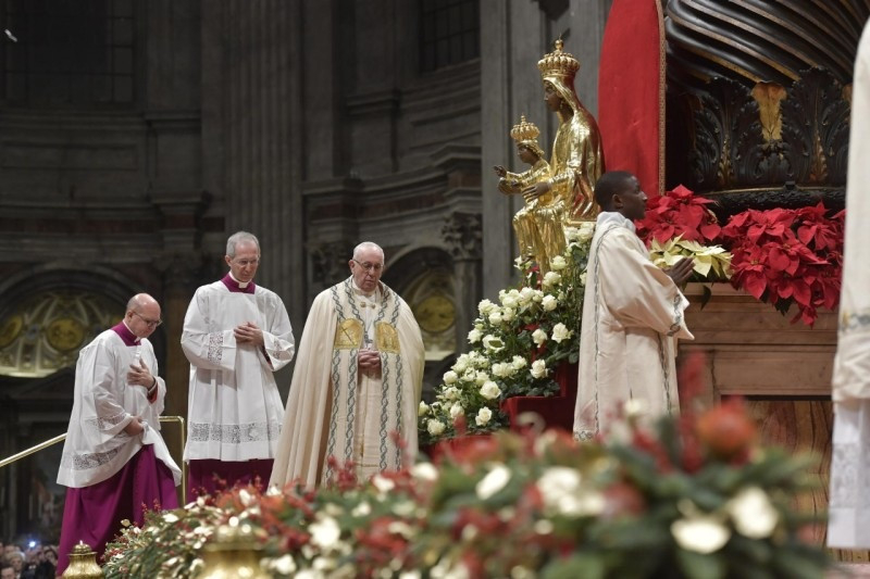 Az Egyház anyaságának ezt a formáját szeretném ösztönözni, amikor Szűz Mária istenanyaságát ünnepeljük. Amikor ezt a titkot szemléljük, felismerjük, hogy Isten „asszonytól született”, hogy megkaphassuk emberiségünk teljességét, a „gyermekként való örökbefogadást”. Isten Fiának leereszkedése emelt föl bennünket. Az ő kicsinységéből származik a mi nagyságunk. Az ő törékenységéből a mi erőnk. Az ő szolgává válásából a mi szabadságunk.