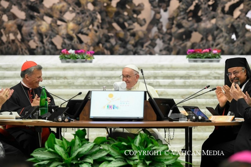 Amikor a szinódus intézménye létesítésének ötvenedik évfordulója volt, a teológusok elkészítettek egy levelet, amelyet aláírtam: egy szép lépés volt előre. De most nekünk kell megtalálnunk a magyarázatot ezen az úton. A szinódus főszereplői nem mi vagyunk, hanem a Szentlélek, és ha teret engedünk a Szentléleknek, a szinódus jól fog sikerülni. Ezeket a Szent Baziltól származó szövegeket különböző nyelveken kaptátok meg: angolul, franciául, portugálul és spanyolul, hogy kézben tarthassátok. Nem idézem most ezeket a szövegeket, de kérem, hogy később gondolkodjatok és elmélkedjetek róluk.