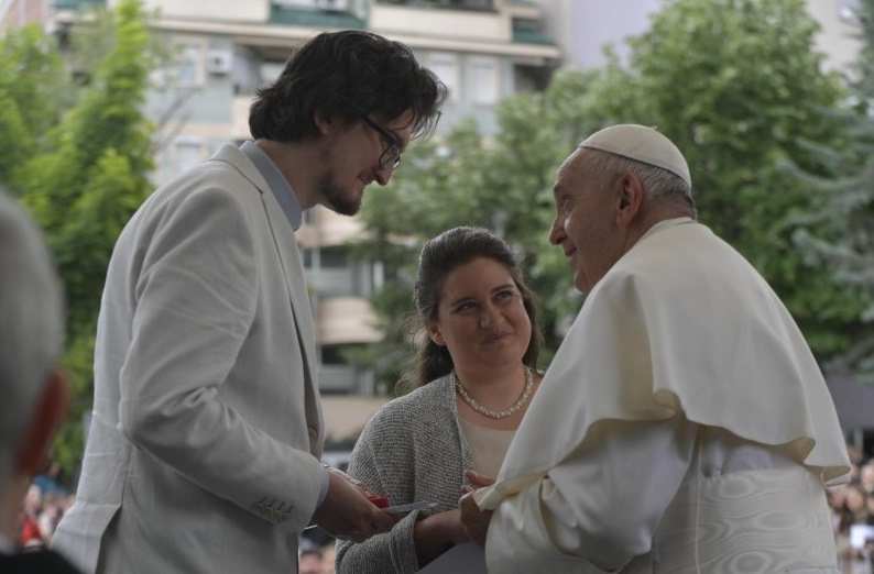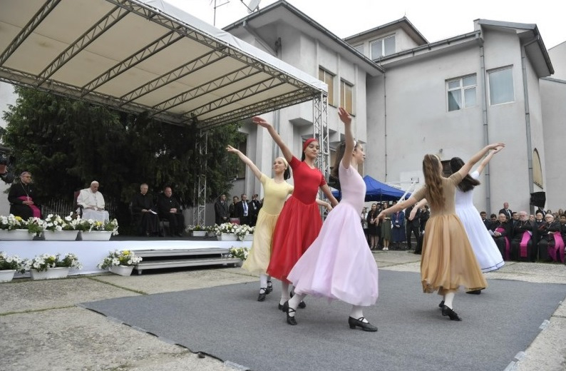 A pápát két fiatal fogadta, akik kenyérrel és sóval ajándékozták meg. A találkozón tanúságot tett egy katolikus-ortodox házaspár, egy muszlim és egy katolikus fiatal. A programot tánc és zenei betétek tették még hangulatosabbá.