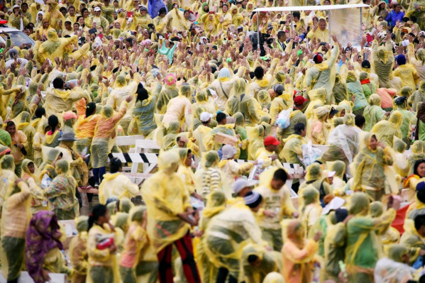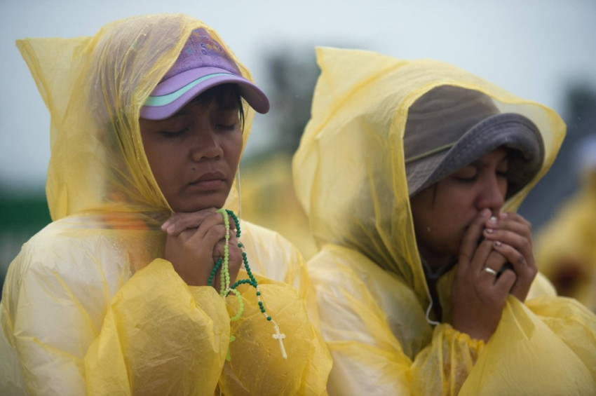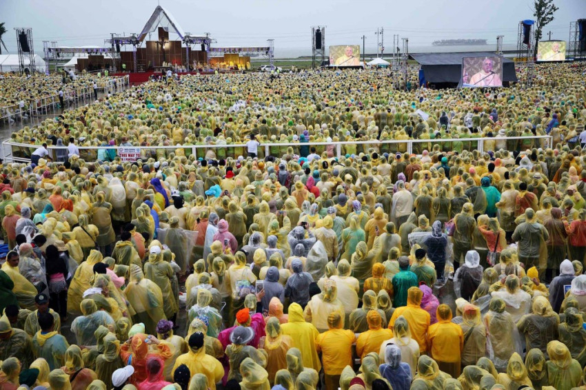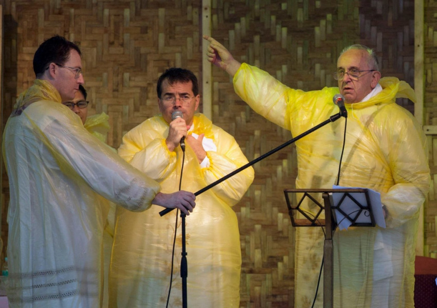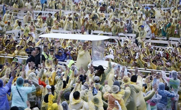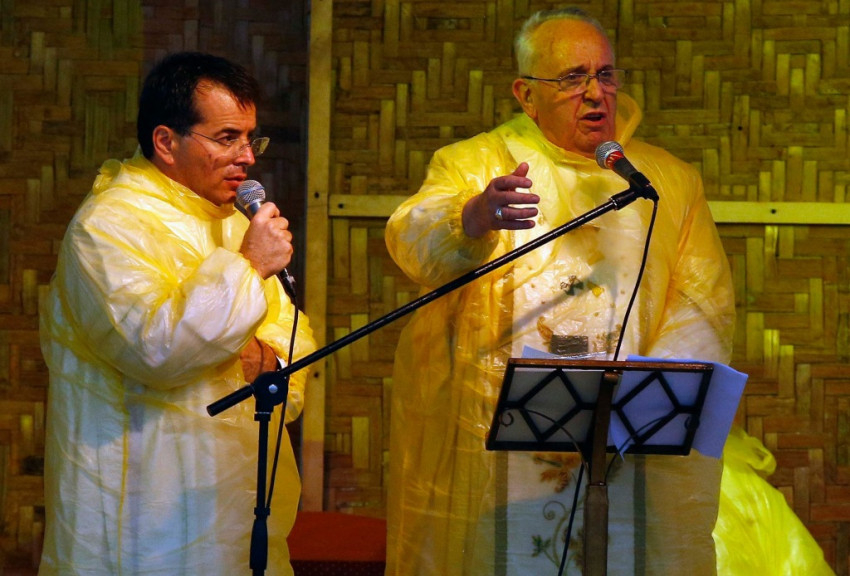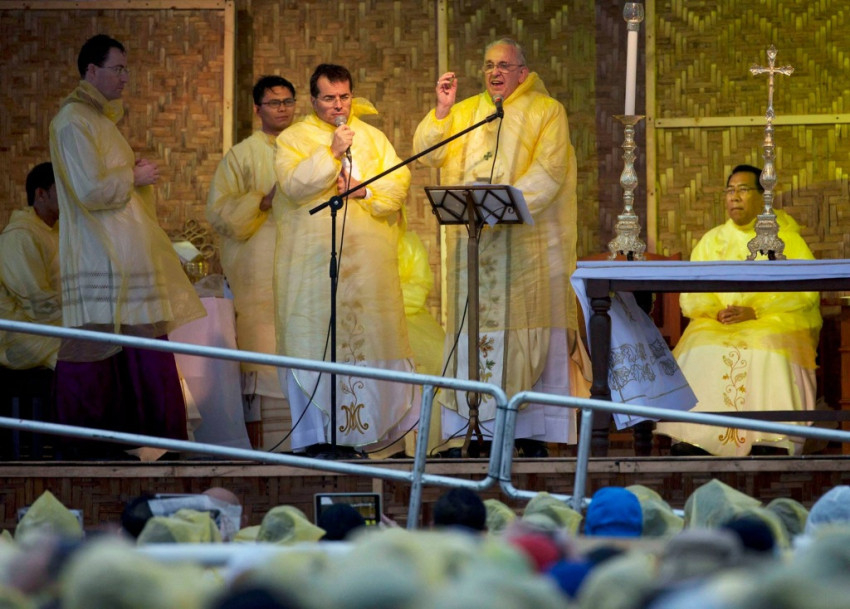 Egy kisebb erősségű tájfun közeledte miatt pár órával előbbre hozták a szentmise kezdetét. A viharos szélben Ferenc pápa maga is sárga műanyag esőkabátot vett fel. Tekintettel a rendkívüli körülményekre a pápa – eltekintve az előre készített homíliájától – teljes egészében szabadon fogalmazta meg beszédét, melyet spanyol nyelven mondott el és amelyet angolra fordítottak. Alábbiakban közreadjuk a Szentatya homíliáját.