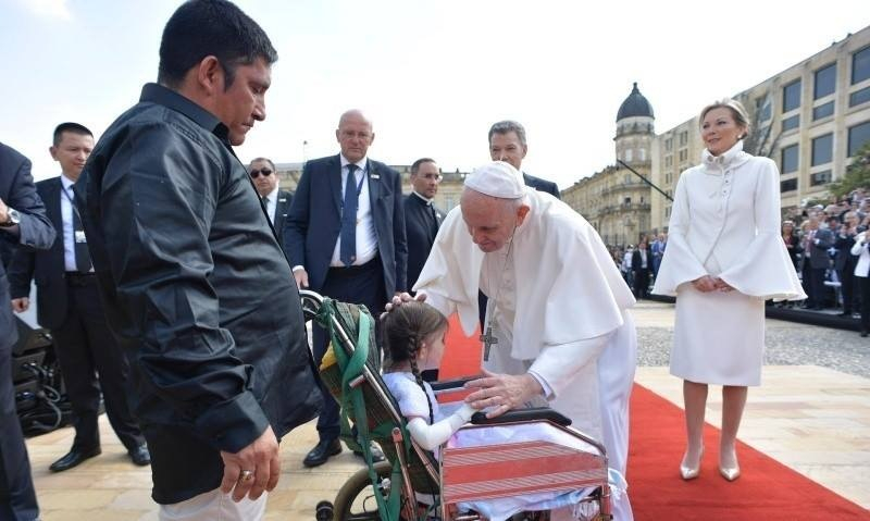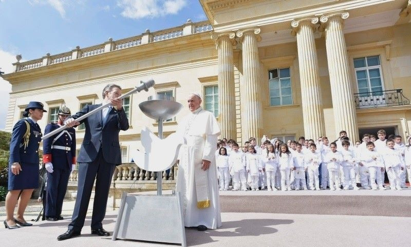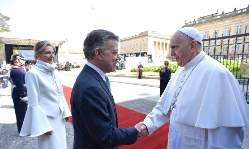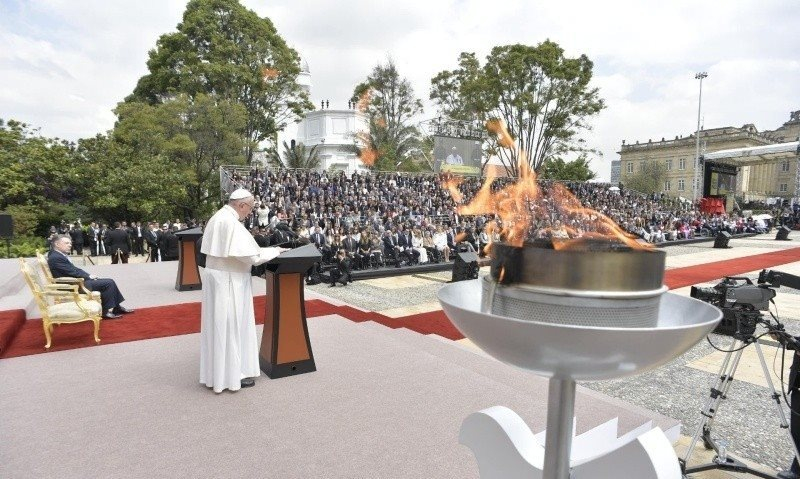 Az elnök szavait után Ferenc pápa mondott beszédet. Az ország történelmének különösen fontos pillanatában jöttem hozzátok – kezdte a Szentatya. – Elődeim, Boldog VI. Pál és Szent II. János Pál pápa nyomdokain járok, s miként őket, engem is az a vágy ösztökél, hogy megosszam kolumbiai testvéreimmel a hit adományát, mely mélyen gyökeret vert ebben az országban, valamint a reménységet, mely mindenki szívében dobog. Ugyanis csak hittel és reménnyel győzhető le az a számos nehézség, amivel Kolumbiának szembe kell néznie.