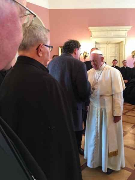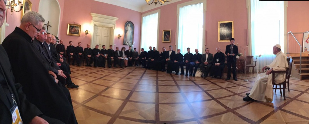 A pápa külön-külön üdvözölte a mintegy harminc jezsuitát, köztük a tartományfőnököket és három tanulórendtagot, és válaszolt néhány kérdésre. A jezsuita egyházfő apostoli látogatásai során mindig időt szakít a város vagy a provincia jezsuitáival való találkozásra. Különösen is hangsúlyozta az ignáci megkülönböztetést (a szellemek megkülönböztetését) a lelkipásztorkodásban.