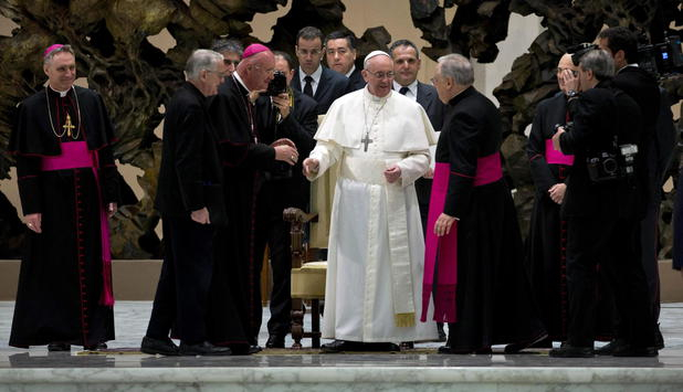 Az Apostoli Palota Bologna termében Ferenc pápa elnökölt azon az összejövetelen, amelyen a Római Kúria dikasztériumainak vezetői vettek részt.