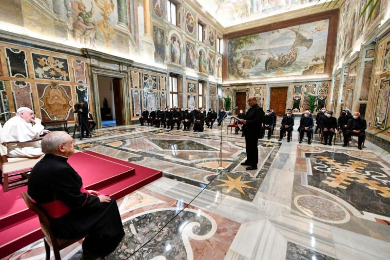 „A 164. rendi nagykáptalan alkalmából fogadlak benneteket. Mekkora út áll e szám mögött, milyen nagy utat jártatok be az isteni gondviselés jegyében! És emiatt milyen nagy hálát kell éreznünk!” – kezdte beszédét a pápa, utalva a teatinusok közel fél évezredes történetére, hiszen VII. Kelemen pápa 1524-ben hagyta jóvá rendi alkotmányukat.