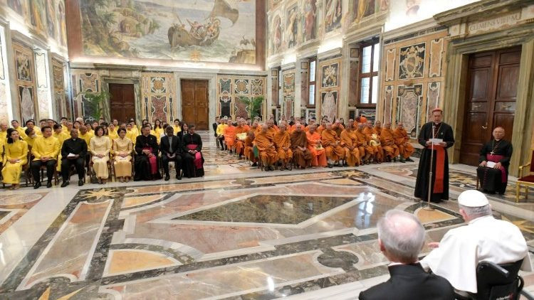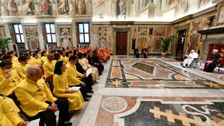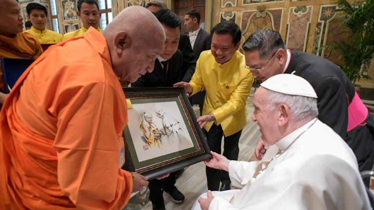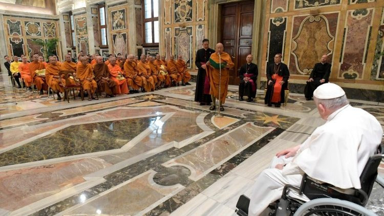 A Szentatya a találkozón visszatekintett az elmúlt fél évszázadra és örömmel állapította meg, hogy fokozatosan erősödött a baráti párbeszéd és a szoros együttműködés a két vallási hagyomány között. Fölidézte a thaiföldi delegáció 2018-as látogatását és megemlítette a Vatikáni Levéltárban őrzött ősi buddhista kéziratot, mely páli nyelven íródott. (A páli nyelv ókori középind nyelv az indoárja nyelvek közül. Leginkább arról ismert, hogy ezen a nyelven íródtak a legkorábbról fennmaradt buddhista szövegek, melyeket a páli kánon őriz. Ez a théraváda buddhizmus liturgikus nyelve.)