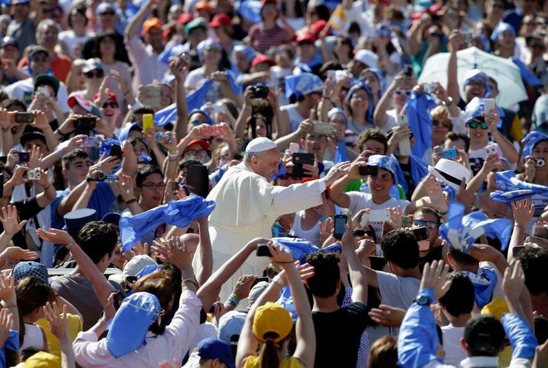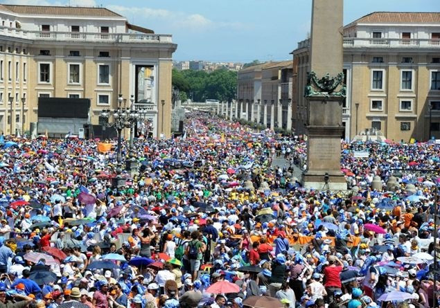 A Szent Péter téren tetőfokára hágott a lelkesedés, amikor nem sokkal délután 4 óra után Ferenc pápa megjelent fehér dzsipjén és lassan körbejárta a teret és a környező utcákat, amelyeket megtöltöttek a különféle iskolák diákjai, színes sapkában, hatalmas feliratokkal, sokszínű zsebkendőjükkel köszöntve a Szentatyát. Ferenc pápa átölelte a felé nyújtott kicsinyeket, meghallgatta, megsimogatta őket, megáldotta a szülőket, tanárokat, mindazokat, akik már a reggeli óráktól kezdve vártak a nagy eseményre: „Olaszország iskolái Ferenc pápával”. A bazilika előtti emelvényre egy táblát és egy iskolapadot helyeztek el, rajta könyvekkel. A tér így valóban egy hatalmas tanteremhez hasonlított, amelynek katedráján Péter utóda ült. Az iskola témájával kapcsolatban elhangzott tanúságtételeket követően a pápa beszédet mondott: