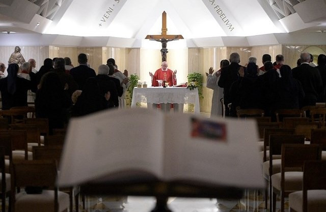 Jót tesz nekünk ma, ha egy kis időt szánunk az imára, előrehaladásunk emlékezetével, a kapott kegyelmek emlékezetével, a kiválasztottság, az ígéret, a szövetség emlékezetével, ha arra törekszünk, hogy felfelé menjünk, az adoráció felé, és adoráció közben nagy alázattal csak ezt a kis imát mondjuk: „Hallgass meg, és bocsáss meg” – zárta hétfő reggeli homíliáját a Szentatya.