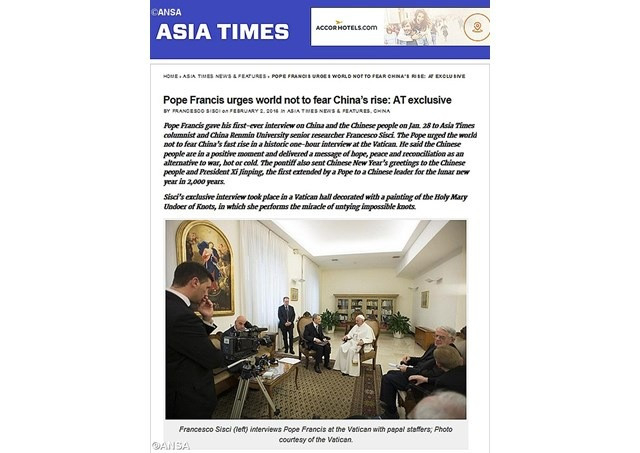 A Vatikánban folytatott egyórás beszélgetésen, amely megérdemli a történelmi jelzőt, a Szentatya arra buzdította a nemzetközi közösséget, hogy ne féljen Kína gyors ütemű növekedésétől. A kínai nép történelmének pozitív korszakát éli, a remény, a béke és a kiengesztelődés üzenetével fordul a világhoz a hidegháborúk és a fegyverekkel vívott háborúk alternatívájaként. A február másodikán közzétett interjú széles körű panorámáját nyújtja a kulturális témáknak, a vallási kérdések érintése nélkül.