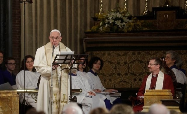 Jonathan Boardman tiszteletes és Robert Innes anglikán püspök fogadták a pápát a plébánián. A szentatya rögtön rátért látogatása céljára, és arról beszélt, együtt kell haladni előre, túllépve a múltbeli gyanakváson, bizalmatlanságon és ellenségeskedésen. A pápa az általa megáldott Üdvözítő Krisztus-ikon kapcsán így fogalmazott: „Olyan, mintha Jézus ránk nézne, és kérne tőlünk valamit: »Kész vagy otthagyni valamit a múltadból értem? Akarsz az én szeretetem és irgalmasságom hírnöke lenni?«”
