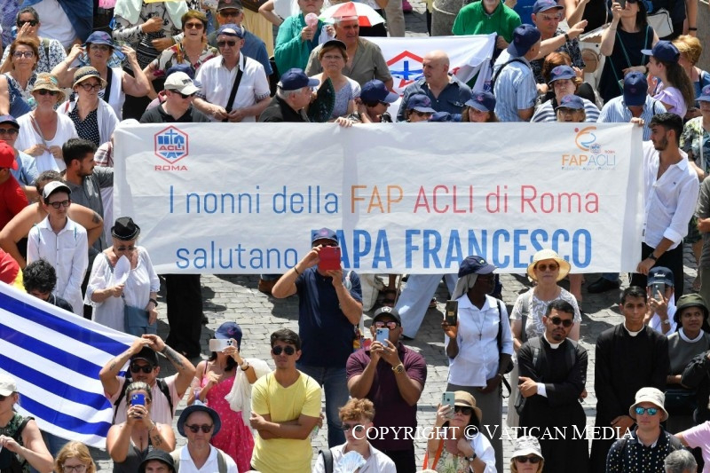 Ma, miközben sok fiatal az ifjúsági világtalálkozóra készül, a nagyszülők és idősek világnapját ünnepeljük. Ezért egy fiatal és egy nagyszülő van mellettem: egy unoka és egy nagymama. Tapsoljuk meg mindkettőjüket!