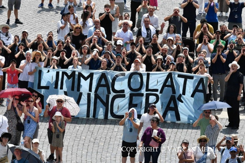 Itt és számos országban szélsőséges éghajlati jelenségeket tapasztalunk: egyfelől rendkívüli hőhullámok és pusztító tűzvészek sújtanak sok térséget, másfelől nem kevés helyen felhőszakadások és árvizek pusztítanak, mint amilyenek az elmúlt napokban Dél-Koreában. Lélekben közel vagyok azokhoz, akik szenvednek, és azokhoz, akik az áldozatoknak és a kitelepítetteknek segítenek. És megismétlem felhívásomat a nemzetek vezetőihez, hogy tegyenek valami konkrétabbat a szennyezőanyag-kibocsátás korlátozása érdekében: ez sürgős feladat, nem tűr halasztást, és mindenkit érint! Védjük meg közös otthonunkat!