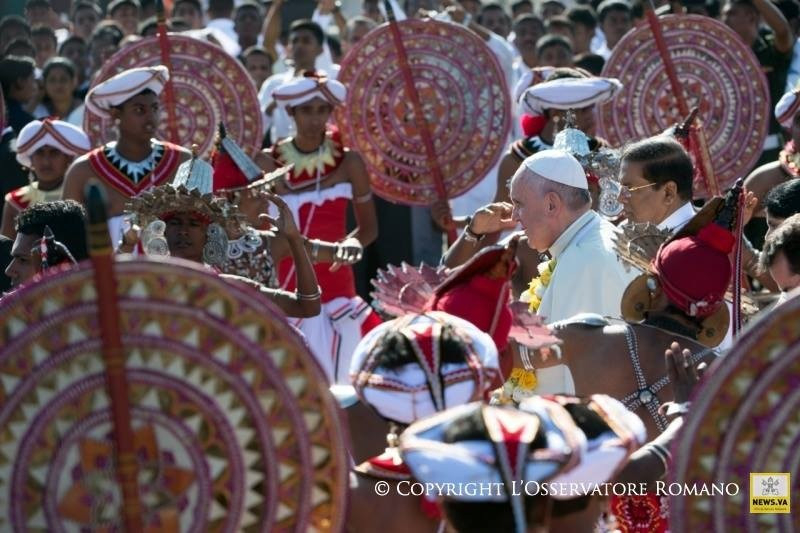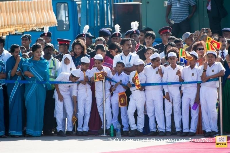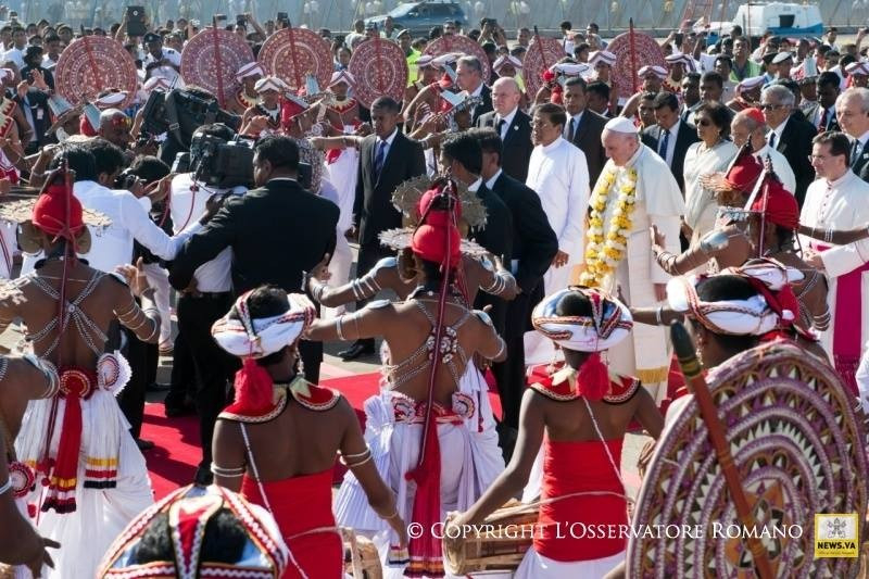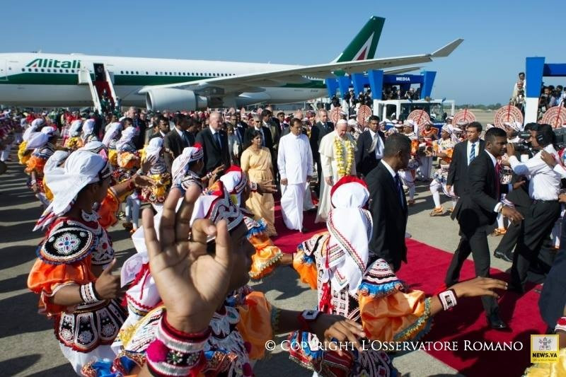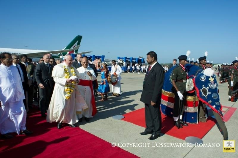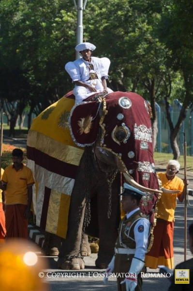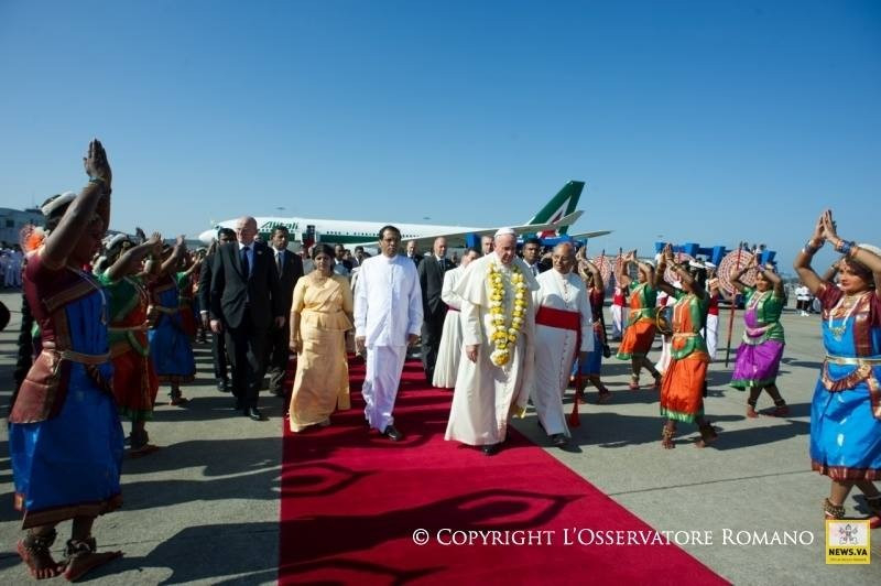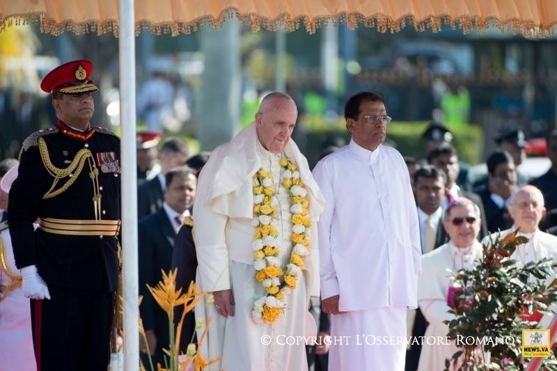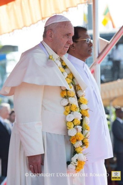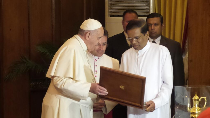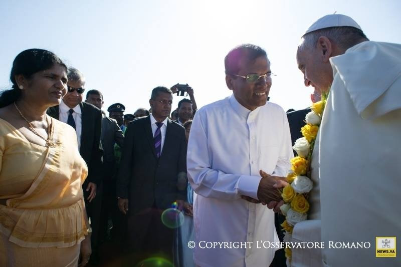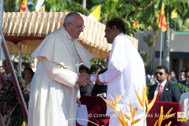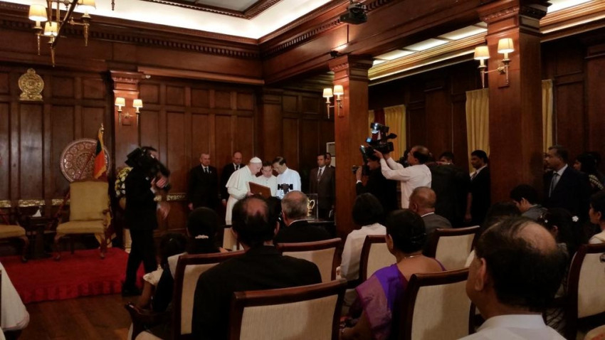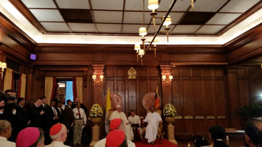 A Szentatya kedden kora délután első hivatalos programjaként udvariassági látogatást tett a szigetország múlt héten megválasztott új köztársasági elnökénél, Maithripala Sirisenánál. Az államfő fogadta a palota bejáratánál. A pápa az előtérben aláírta a vendégkönyvet egy rövid üzenettel: „Azokra, akik a szeretett Srí Lanka-i népet szolgálják, a bátorság, a bölcsesség és a megfontoltság isteni ajándékait kérem.” Magánmegbeszélést tartottak, majd bemutatták a Szentatyának az államfő családtagjait, és sor került az ajándékok kicserélésére. Ezt követően az elnök a nagyteremben bemutatta a pápának a politikai élet képviselőit, és egy rövid ceremóniát tartottak abból az alkalomból, hogy bélyegsorozatot adtak ki a pápai út kapcsán.