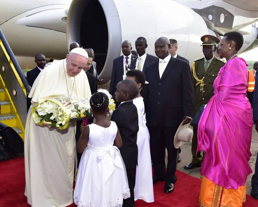 Az ugandai nép az entebbe-i repülőtéren pergő dobokkal és törzsi tánccal várta a Szentatyát, és a repülőtérről az elnöki palotáig vezető 7 km-es úton is nagy tömeg üdvözölte őt.