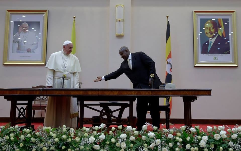 Az elnöki rezidencián (State House) a pápa találkozott a hatóságok vezetőivel és a diplomáciai testület tagjaival, akikhez beszédet intézett. Ebben kiemelte, hogy látogatása csúcspontja az ugandai vértanúk szentté avatásának ötvenedik évfordulója, de reméli, hogy utazása egyben fölhívja a figyelmet az egész afrikai földrészre.