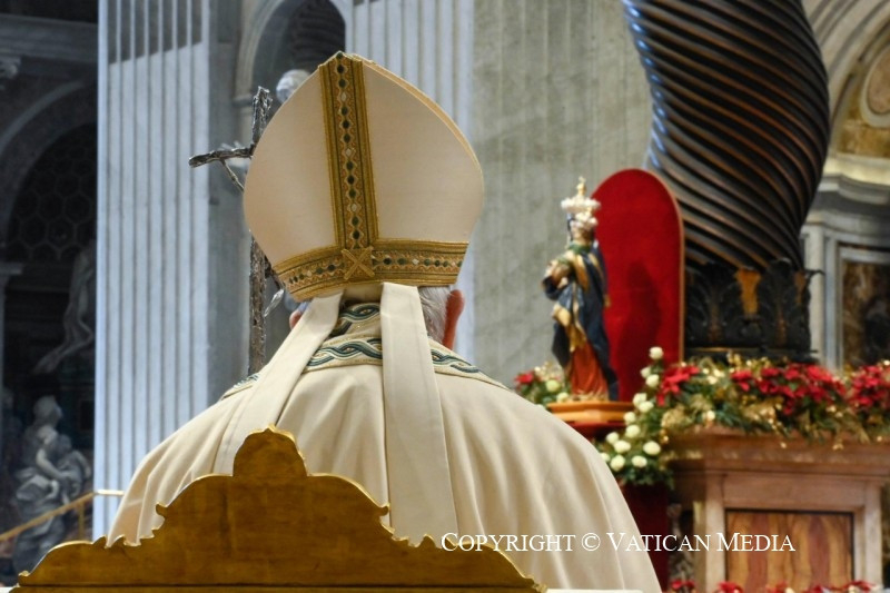 Különösen imádkozzunk az anyához azokért a szenvedő gyermekeiért, akiknek már nincs erejük imádkozni, a világ oly sok részén háború által sújtott testvéreinkért, akik sötétben és hidegben, nyomorban és félelemben, erőszaktól és közönytől körülvéve élik meg ezeket az ünnepnapokat! Azokért, akiknek nincs békéjük, kérjük Máriát, az asszonyt, aki a béke fejedelmét hozta a világra (vö. Iz 9,5; Gal 4,4). Benne, a béke királynőjében válik valóra az olvasmányban hallott áldás: „Fordítsa feléd arcát az Úr, és adjon neked békességet” (Szám 6,26). Egy anya kezén keresztül akar Isten békéje belépni otthonunkba, szívünkbe, világunkba. De hogyan fogadhatjuk be őt?