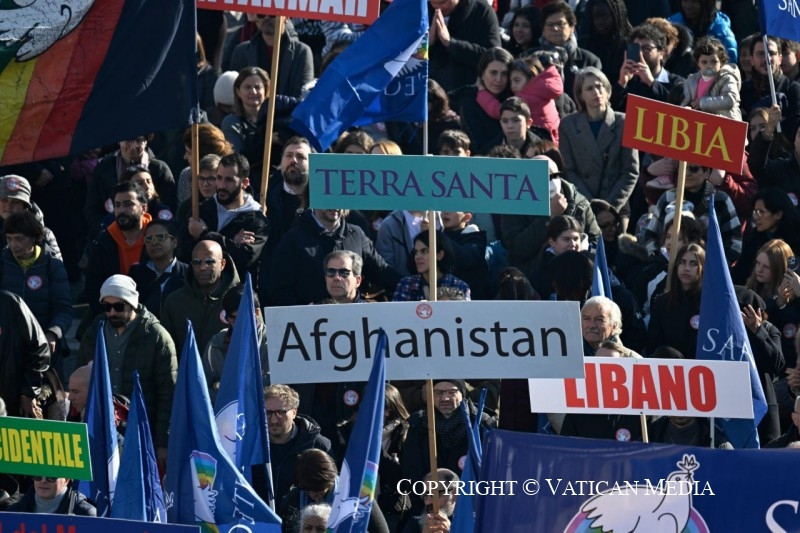 Szeretném kifejezni hálás megbecsülésemet mindazoknak, akik a háborús konfliktusok számos területén a párbeszédért és a tárgyalásokért dolgoznak. Imádkozzunk, hogy minden fronton megszűnjenek a harcok, és eltökélten törekedjenek a békére és a megbékélésre! Gondolok a meggyötört Ukrajnára, Gázára, Izraelre, Mianmarra, a kongói Kivu tartományra és a háborúban álló megannyi népre. Az „A Sua Immagine” [Az Ő képmására] című tévéműsorban láttam felvételeket és fényképeket a háború okozta pusztításról.