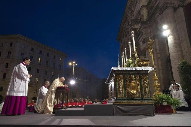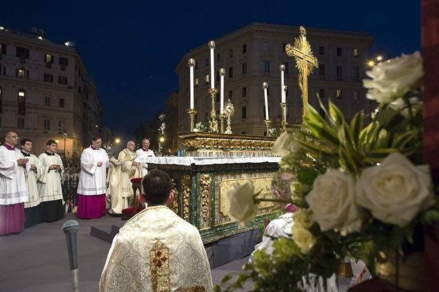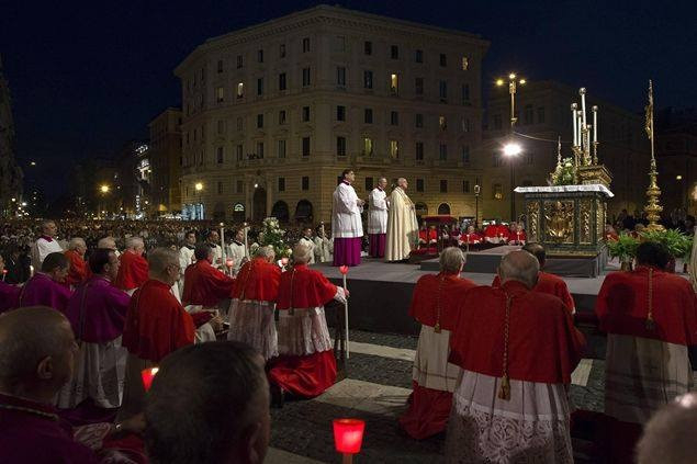 A szentmise után Ferenc pápa a Santa Maria Maggiore-bazilika egyik kápolnájában imádkozva várta a lateráni Szent János-bazilikától indult körmenetet. Az Eucharisztiát szállító jármű fedélzetén két diakónus térdelt, míg mögötte Agostino Vallini bíboros, a pápa római helynöke haladt. Az Oltáriszentséget köszöntő énekek és imádságok után Ferenc pápa szentségi áldást adott a hívekre.