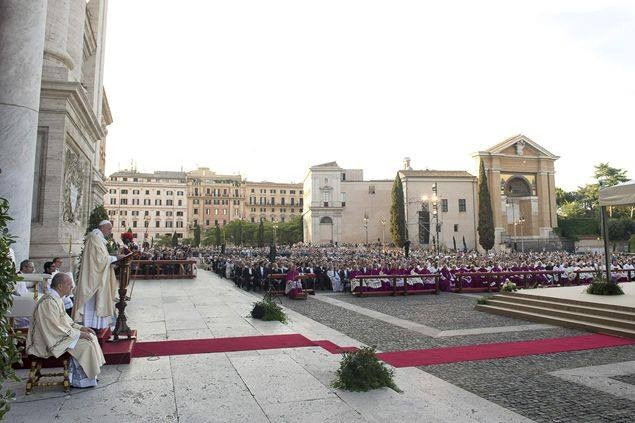 „Veszély van? Fenyegetés?” – tette fel a kérdést a pápa, és a liturgia által ajánlott két kulcskifejezéshez fűzte gondolatait, amelyek: megosztottság és elértéktelenedés. Akkor leszünk megosztottak, amikor nem engedelmeskedünk az Úr Szavának, amikor nem éljük a testvériséget egymás között, amikor az első helyekért versengünk, mint a törtetők, amikor nincs bátorságunk tanúságot tenni a szeretetről, és amikor nem nyújtunk reményt. Így tényleg megosztottak leszünk. Az Eucharisztia ellenben nem engedi meg, hogy szétszakadjunk, mert éppen a közösség köteléke, a szövetség beteljesülése, Krisztus szeretetének élő jele. A szentáldozás révén ebbe az útba kapcsolódunk bele. „Krisztus köztünk van, a szeretet ereje győzzön le minden szakadást, és egyidejűleg legyünk egységben a legszegényebbel és a gyengével is” – mondta a pápa.
