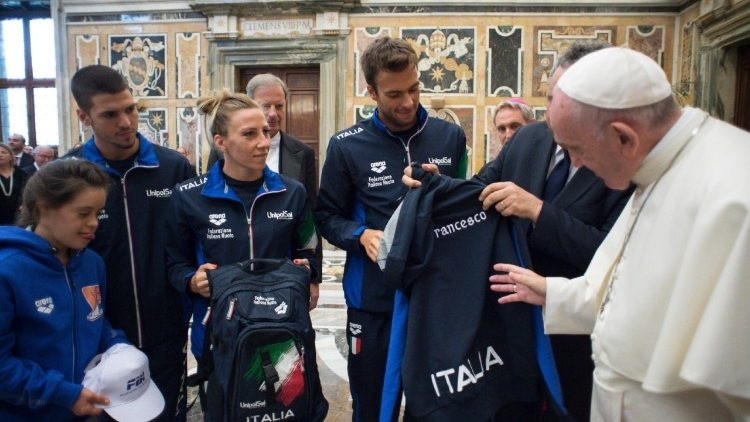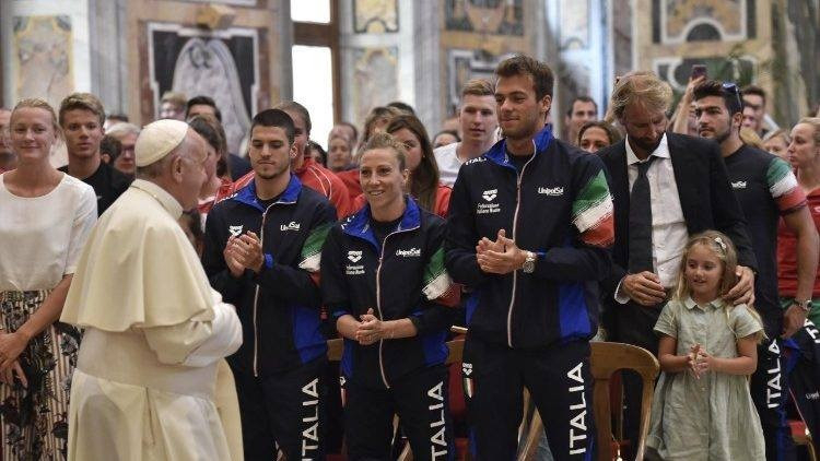 Ferenc pápa beszédében elismerően szólt a sportolók erőfeszítéseiről, amit a céljuk érdekében nap mint nap tesznek. „Ti mindannyian bizonyítjátok, hogy a célok elérhetők kemény edzéssel, ami szigorú elkötelezettséget és áldozatokat kíván. Mindez az élet nagyszerű leckéje, amely kifejezetten jó példa lehet a titeket követő fiatal generációk számára.” Az úszás, csakúgy mint a többi sportág, ha tisztességesen űzik, emberi és társadalmi értékekre nevel – hangsúlyozta a pápa. A testen túl a jellemet és az akaratot is erősíti, és a társak megismerésére és kölcsönös elfogadására ösztönöz.