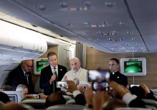 A hosszú repülőút kezdetén Greg Burke szentszéki szóvivő a pápával utazó újságírók nevében köszöntötte a Szentatyát, és egy kérdést tett fel neki: „Szentatya, Isten hozta köztünk! Egyszer valaki azt kérdezte tőlem, hogy Ön tart-e sajtókonferenciát az odaút során is. Én erre akkor azt válaszoltam: még nem. Nem hinném, hogy most változtatna ezen…”
