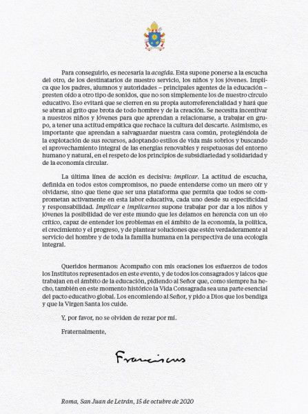 Kedves testvéreim! Imáimmal kísérem az eseményen képviselt összes intézmény erőfeszítéseit, és mindazon megszentelt személyek és világi hívők erőfeszítéseit, akik a nevelés területén dolgoznak. Kérem az Urat, hogy a szerzetesség – mint mindig is tette – ebben a történelmi időszakban is a globális nevelési egyezmény lényegi részét képezze. Az Úrnak ajánllak benneteket! Kérem Istent, hogy áldjon meg, a Szűzanya pedig védelmezzen benneteket.