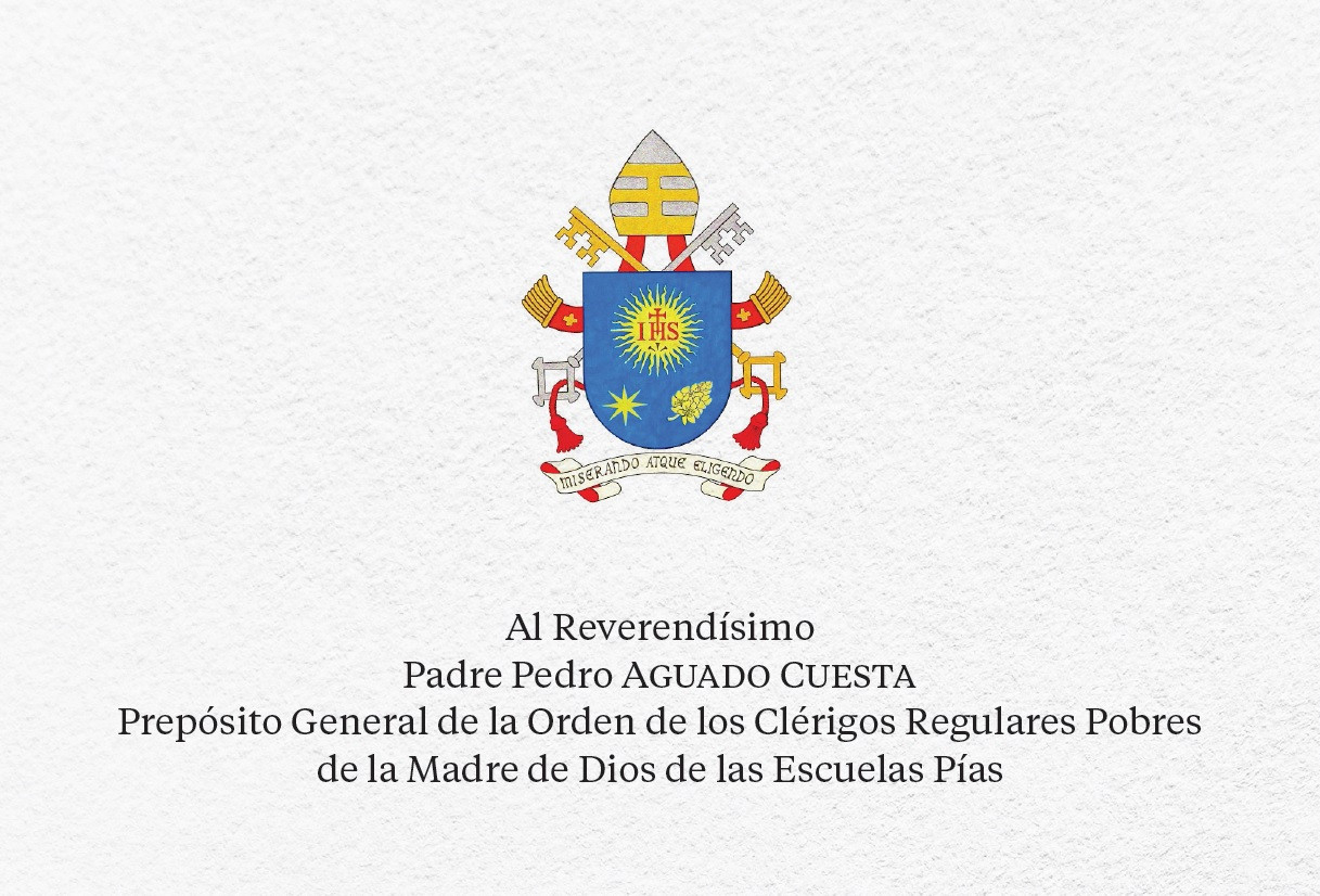 A szerzetesség mindig is az előhadat képviselte a nevelés feladatában. Jó példa erre alapítótok, Kalazanci Szent József, aki elsőként nyitott iskolát a gyerekeknek, de példák azok a szerzetesek is, akik Estadilla községben tanították őt, sőt sokkal korábban a középkori kolostorok is, melyek megőrizték és elterjesztették a klasszikus kultúrát. Ebből az erős gyökérből nőttek ki a történelem minden korszakában a különféle karizmák, melyek Isten kegyelméből képesek voltak alkalmazkodni a különböző helyek és korszakok szükségleteihez és kihívásaihoz. Az Egyház ma arra hívja őket, hogy saját identitásukra alapozva megújítsák elköteleződésüket. Köszönöm, hogy oly nagy buzgalommal és lelkesedéssel ragadtátok kézbe ezt a „váltóbotot”.