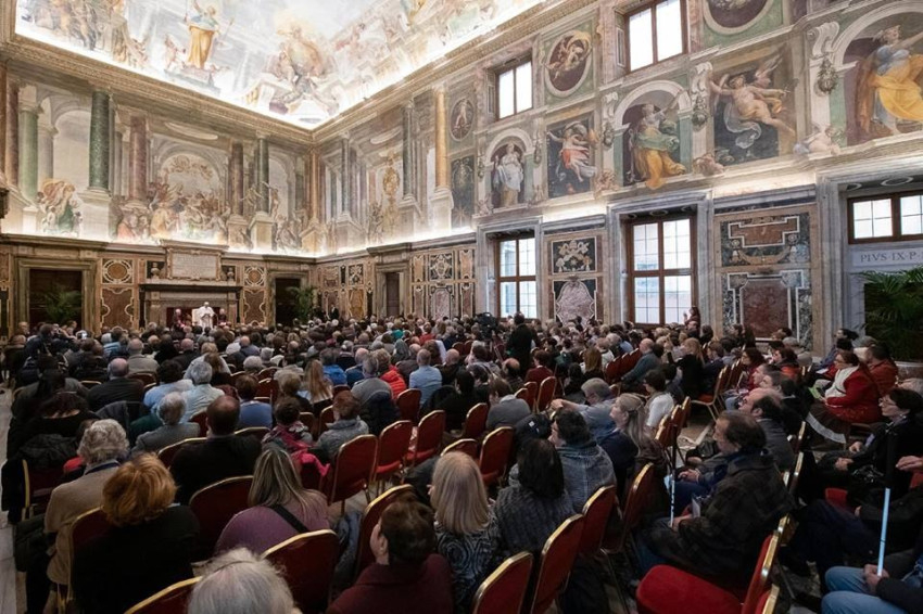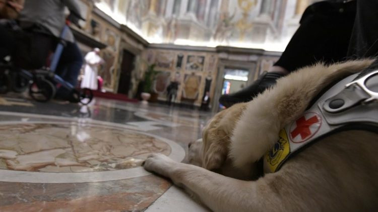 Tolókocsiban ülő vakok és gyengénlátók segítő társaikkal és vakvezető kutyáikkal együtt érkeztek a Vatikánba. A Szentatya az Apostoli Palota Kelemen termében fogadta a négyszázfős közösséget.