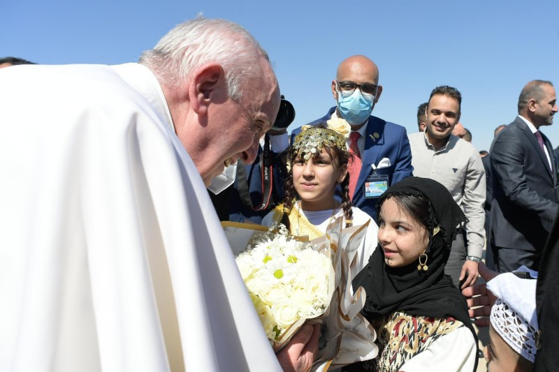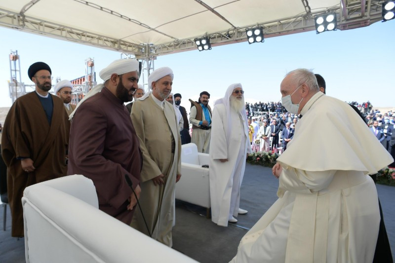 És mi, hívők, nem hallgathatunk, amikor a terrorizmus visszaél a vallással. Sőt, a mi dolgunk egyértelműen eloszlatni a félreértéseket. Ne engedjük, hogy az Ég fényét eltakarja a gyűlölet felhője! Ezt az országot a terrorizmus, a háború és az erőszak sötét felhői lepték be. Minden etnikai és vallási közösség szenvedett tőle. Külön szeretném megemlíteni a jeziditákat, akik sok ember halálát gyászolták, akik közül több ezer nőt, lányt és kisgyermeket raboltak el, akiket eladtak rabszolgának, fizikai erőszaknak vetettek alá és áttérésre kényszerítettek. Ma imádkozzunk mindazokért, akik ilyen szenvedéseken mentek át, akiket még mindig elveszettként vagy elraboltként tartanak számon, hogy mihamarabb visszatérhessenek otthonaikba! Imádkozzunk azért is, hogy a lelkiismereti szabadságot és a vallásszabadságot mindenütt tiszteletben tartsák és elismerjék: ezek alapvető jogok, mert szabaddá teszik az embert arra, hogy szemlélje az Eget, amelyért teremtetett.
