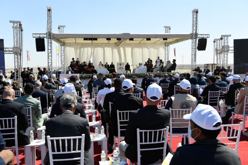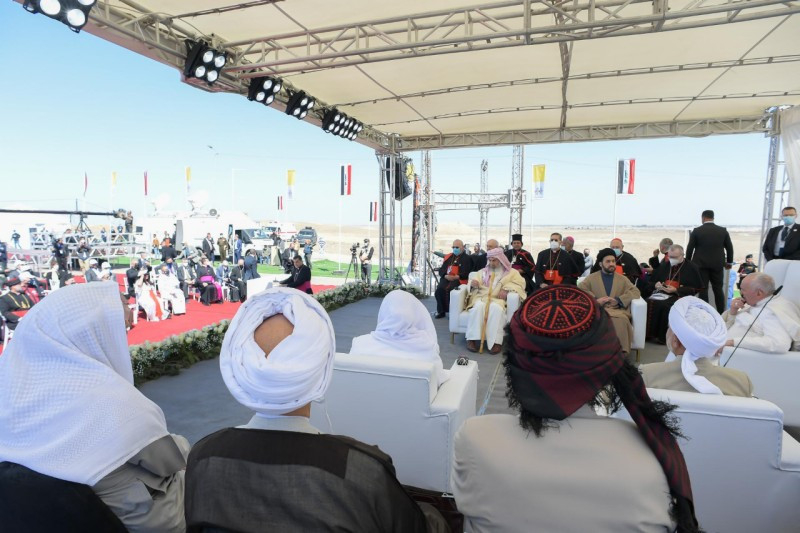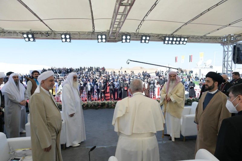 Amikor a terrorizmus behatolt e szeretett ország északi részébe, barbár módon elpusztította csodálatos vallási örökségének egy részét, különféle közösségek templomait, kolostorait és istentiszteleti helyeit. De abban a sötét időszakban is ragyogtak csillagok. A moszuli fiatal muszlim önkéntesekre gondolok, akik segítettek templomok és kolostorok rendbehozásában, testvéri barátságokat építettek a gyűlölet törmelékei fölött, továbbá azokra a keresztényekre és muszlimokra gondolok, akik ma közösen állítanak helyre mecseteket és templomokat. Ali Thajeel professzor úr arról is beszámolt nekünk, hogy visszatértek a zarándokok ebbe a városba. Fontos elzarándokolni a szent helyekre: az Ég iránti vágyakozás legszebb jele a Földön. Ezért a szent helyek szeretete és őrzése egzisztenciális szükség, emlékezve Ábrahám atyánkra, aki különböző helyeken oltárokat emelt az Úrnak az ég felé (vö. Ter 12,7,8; 13,18; 22,9). A nagy pátriárka segítsen bennünket abban, hogy minden szent helyet a béke és találkozás oázisává tegyünk mindenki számára! Isten iránti hűsége révén ő áldássá lett minden nép számára (vö. Ter 12,3); az, hogy ma itt vagyunk az ő nyomdokain, legyen az áldás és remény jele Irak, a Közel-Kelet és az egész világ számára!