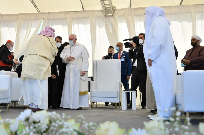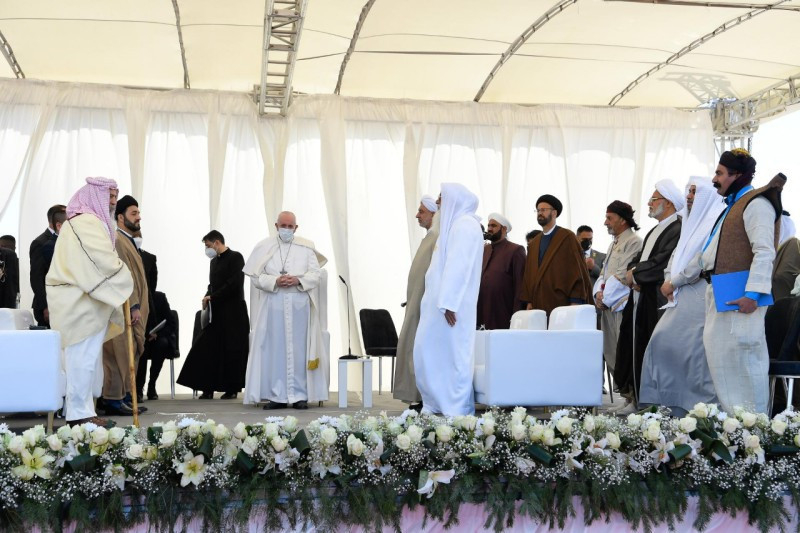 Ábrahám útja békét hozó áldás volt. De nem volt könnyű: küzdelmekkel és váratlan eseményekkel kellett szembenéznie. Előttünk is rögös út áll, de a nagy pátriárkához hasonlóan nekünk is konkrét lépéseket kell tennünk, úgy kell vándorolnunk, hogy felfedezzük a másik arcát, hogy osztozzunk emlékeken, tekinteteken és hallgatásokon, történeteken és tapasztalatokon. Szíven ütött Dawoodnak és Hasannak, egy kereszténynek és egy muszlimnak a tanúságtétele, akik anélkül, hogy a különbségek eltántorították volna őket, együtt tanultak és dolgoztak. Együtt építették a jövőt, és testvérként fedezték fel egymást. Az előrehaladáshoz nekünk is valami jót és konkrétat kell tennünk együtt. Ez a követendő út, különösen a fiatalok számára, akik nem kerülhetnek abba a helyzetbe, hogy a múlt konfliktusai tönkretegyék álmaikat! Sürgős feladatunk, hogy a testvériségre és a csillagokra nézésre neveljük őket. Ez valódi vészhelyzet; ez lesz a leghatékonyabb vakcina a békés holnap számára. Mert, kedves fiatalok, ti vagytok a mi jelenünk és jövőnk!