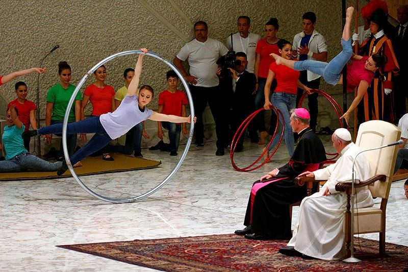 A pápa gratulált nekik, mivel az irgalmasság szentévében elvitték előadásaikat a legszegényebbekhez, a hajléktalanokhoz, a bebörtönzöttekhez, a hátrányos helyzetű fiatalokhoz. Ez is az irgalmasság része: elhinteni a szépség és a vidámság magvait az olykor szomorú, komor világban. Tevékenységük a szórakoztatás legősibb formája, amely mindenki számára elérhető, terjeszti a találkozás kultúráját. A pápa arra buzdította a vándorművészeket, hogy mindig legyenek nyitottak a kicsinyek, a rászorulók iránt. Emlékeztette őket Szent Pál szavaira, aki így ír a római levélben: „aki irgalmasságot gyakorol, tegye örömest” (Róm 12,8).