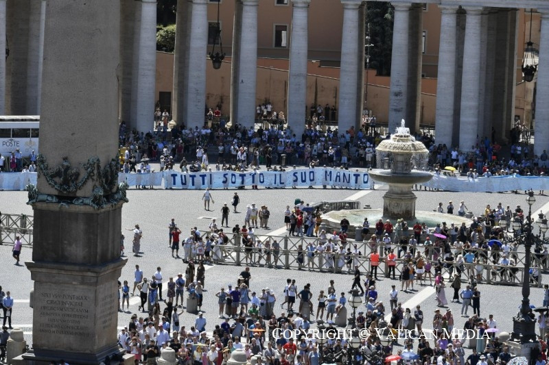 Köszöntöm a pisai világi ferences rend testvériségét; a gubbiói, perugiai és spoletói fiatalokat; a Limbadiból érkezett csoportot, mely a település védőszentjét, a fiatal Szent Pantaleót ünnepli; a cesenai és longianói autós zarándoklat résztvevőit; továbbá a Radio Maria Italia önkénteseit, akik egy nagy transzparenssel arra hívnak mindannyiunkat, hogy helyezzük magunkat Szűz Mária „köpenye alá”, hogy Istentől a béke ajándékát kérjük. És ezt különösen a meggyötört ukrán népért kérjük.