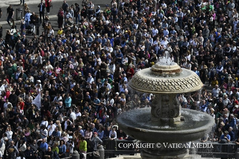 Köszöntelek mindannyiatokat, akik Rómából, Olaszországból és a világ számos tájáról érkeztetek. Külön is köszöntöm a „Camplus” egyetemi kollégiumi hálózat spanyol hallgatóit, a madridi, pescarai, chieti, locorotondói egyházközségi csoportokat, továbbá a római San Giovanni Leonardi-plébániáról érkezett csoportot. Köszöntöm a comói Szent József szociális szövetkezetet, a perugiai gyerekeket, a hitvallás letétele felé tartó bolognai fiatalokat, valamint a paviai, a Iolo di Prató-i és a Cavaion Veronese-i bérmálkozókat.