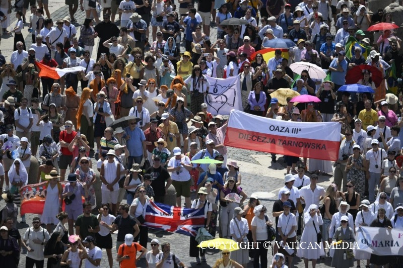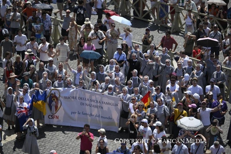 Köszöntelek benneteket, rómaiak, Olaszországból és számos más országból érkezett zarándokok! Külön is köszöntöm a Szent Ágoston-rendhez kapcsolódó világiak nemzetközi kongresszusának résztvevőit. Köszöntöm a Názáreti Szent Család Nővéreit, akik most tartják általános káptalanjukat. Köszöntöm az Alto Adigében található lusoni egyházközség fiataljait, akik végigjárták a Via Francigenát. Üdvözlöm a Földközi-tenger Ifjúsági Tanácsát, ők tiszteletreméltó Giorgio La Pira üzenetét idézik fel. Üdvözlöm a Regnum Christi növendéknevelői nemzetközi tanfolyamának fiatal résztvevőit.