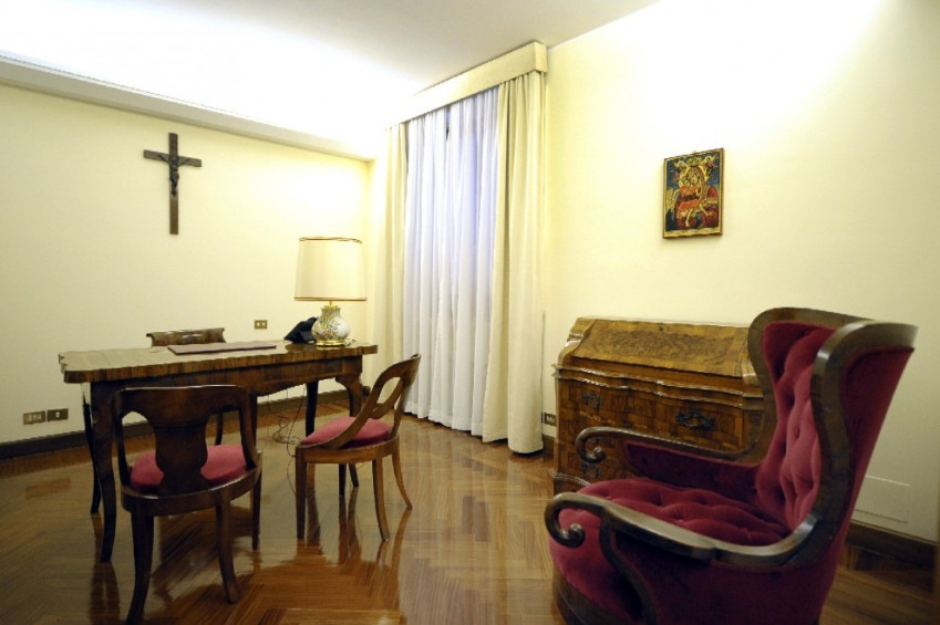 A fotókon a Vatikánváros területén levő Szent Márta-ház második emeleti lakosztálya látható. Itt él Ferenc pápa tavaly márciusi megválasztása óta. A La Repubblica című napilap spártaian egyszerűnek nevezte az egyházfő vatikáni lakhelyét.