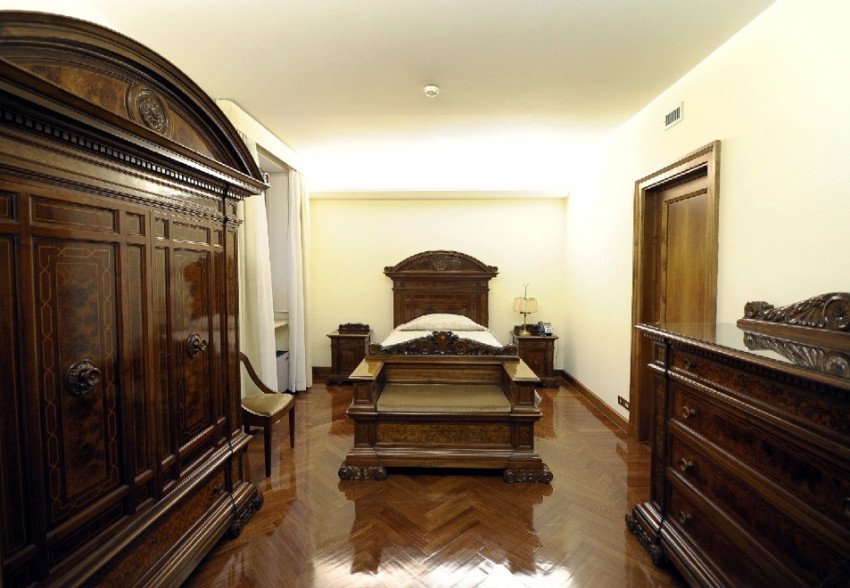 A 201-es a Szent Márta-ház legnagyobb lakosztálya: egy nappaliból és egy hálószobából áll saját fürdőszobával. A nappaliban egy dívány, fotelek, egy íróasztal és egy kisméretű televízió van. A nagyméretű, nehéz fabútorok többsége régi stílusú. A lakosztályt neonfény világítja meg és csillogóra fényesítik a parkettát, közölték az olasz portálok.