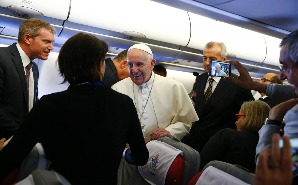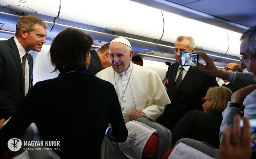 Ferenc pápa „jó utat és jó munkát” kívánt a sajtó képviselőinek. „Ha nem tévedek – mondta – akkor ez lesz az eddigi leghosszabb utam, lesz tehát munkátok bőven. Nagyon köszönöm nektek ezt a munkát és amit még megtesztek. Lombardi atya a béke szólt használta az előbb. Azt hiszem, hogy a világ ma nagyon ki van éhezve a békére. Háborúk dúlnak, emberek menekülnek.., ez a menekülthullám a háborúkból jön, hogy elmeneküljön a halálból, hogy életet keressen másutt. Lelkesítő volt ma reggel találkozni a Szent Anna kapunál azon két szíriai menekült család egyikével, akiket befogadott a Vatikán. Láttam a fájdalmat az arcukon… Az a szó béke, tehát köszönöm amit csináltok, hogy a béke apró hídjait építitek és ezek együtt adják ki a béke nagy hídját”.