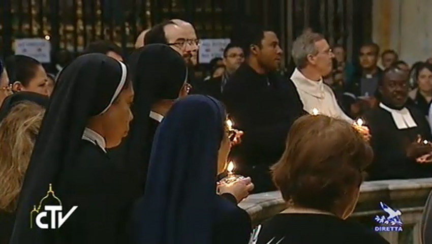 Szeretettel köszöntöm a Megszentelt Élet Intézményei és Apostoli Élet Társaságai Kongregációjának minden tagját, továbbá mindazokat, akik részt vesznek az imavirrasztáson a Santa Maria Maggiore-bazilikában, a Boldogságos Szűz, a Salus Populi Romani anyai oltalma alatt. Veletek együtt köszöntöm a világon élő és munkálkodó valamennyi megszentelt férfit és nőt.